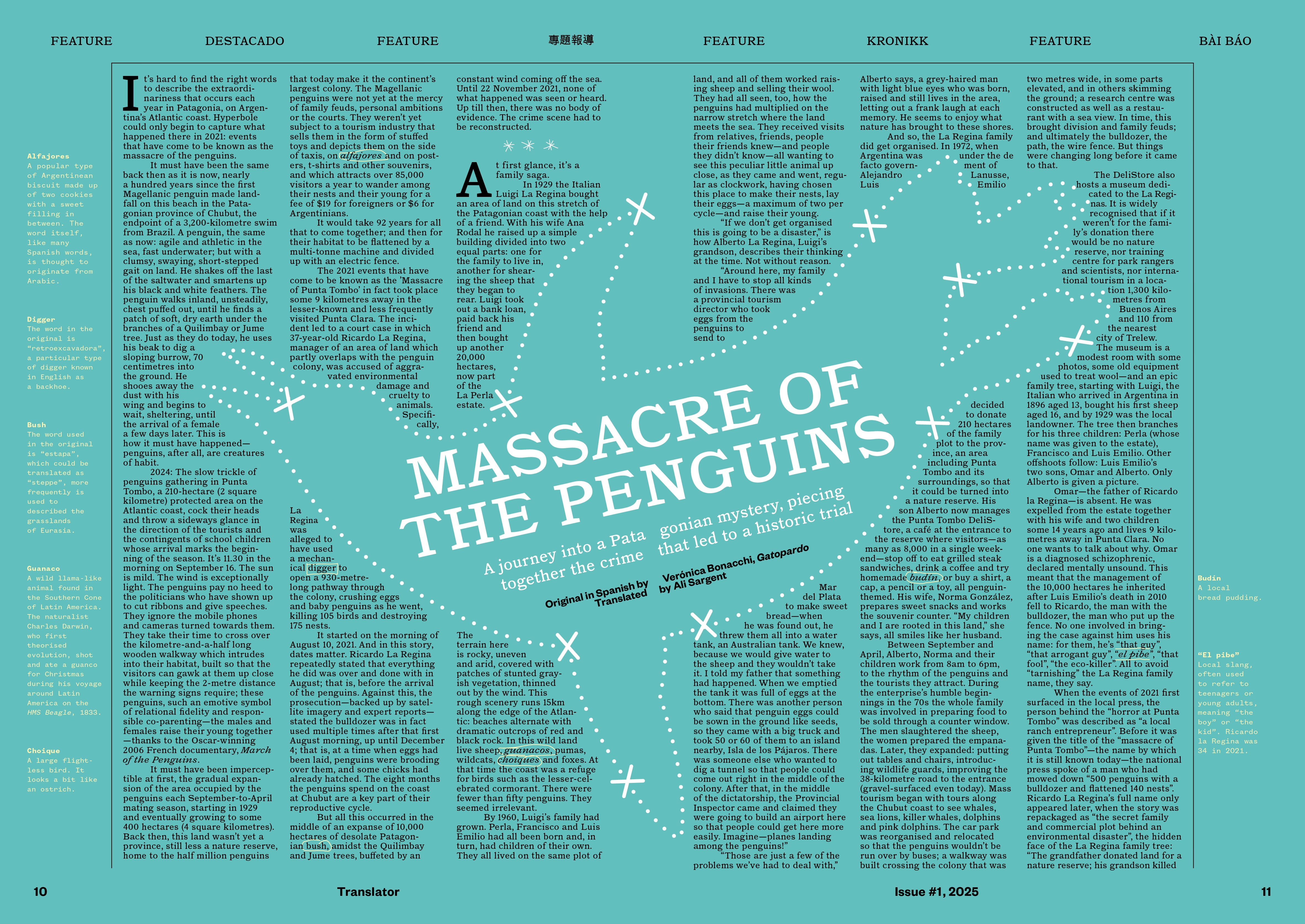 ‘The Massacre of the Penguins’ is an extraordinary piece: part true crime investigation, part meditation on our relationship to nature, part family saga, part introduction to the fascinating history of this southernmost part of Latin America. The rhythm of the story reflects the landscape where it takes place: spare, beautiful, surprising. Reading it, one can hear the wind of the place, one can feel the sense of being on the edge.